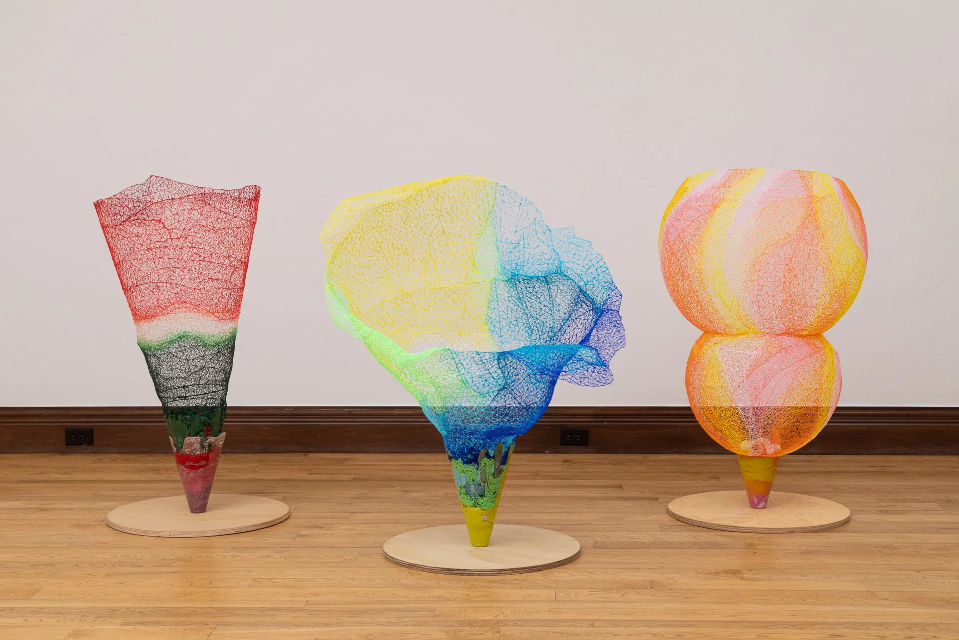 From left, ‘Spectre #5’ 2026, 21" x 42" 21", ‘Spectre #1’ 2026, 37" x 45 " x 25", ‘Spectre #3’ 2026, 26" x 45 1/2" x 26", 3D pen-formed bio-plastic, reclaimed plastic, wood.