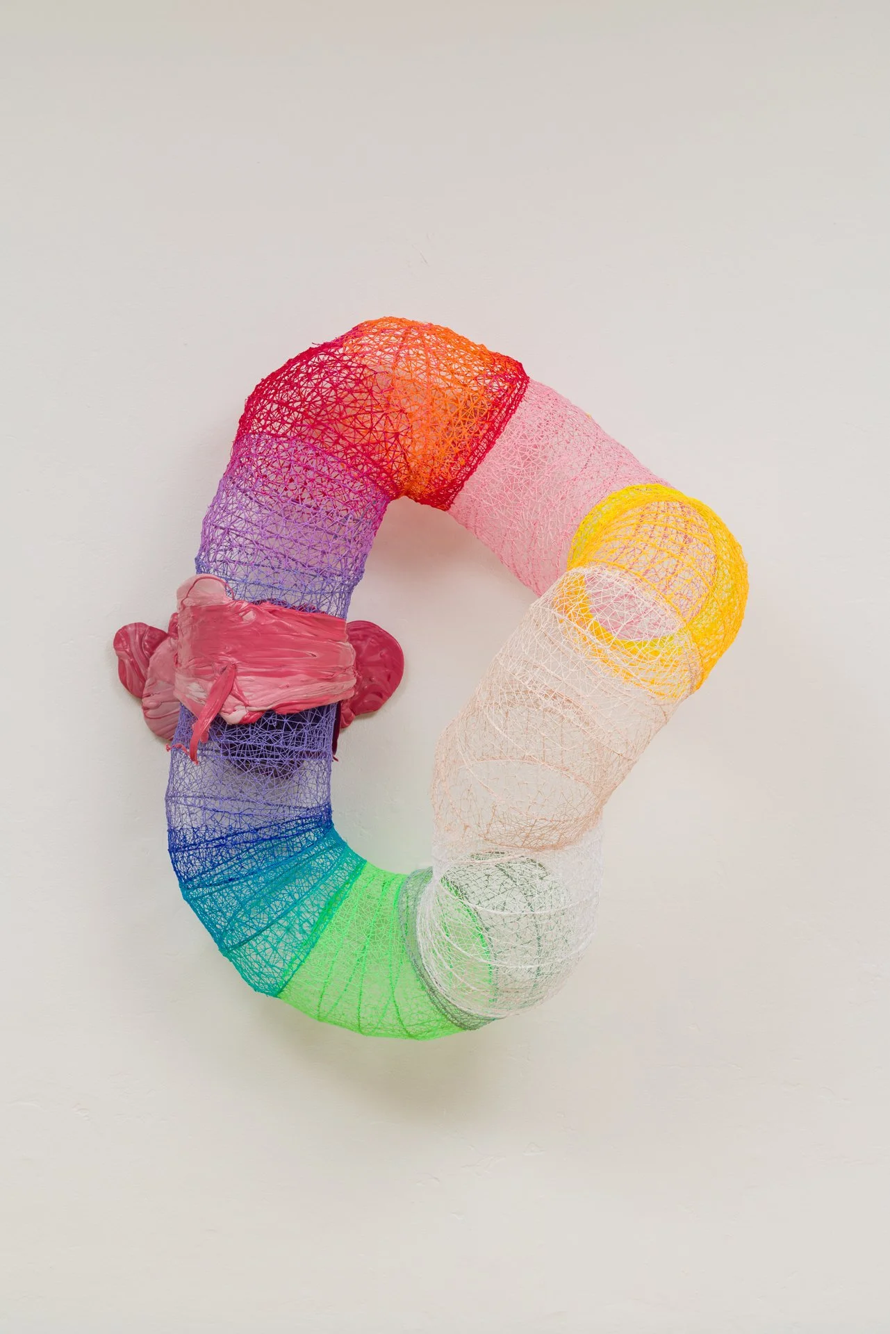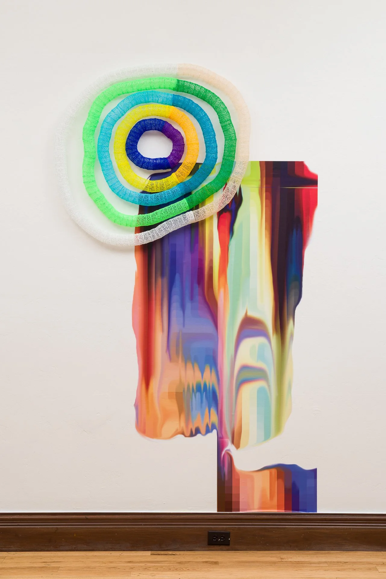 ‘Protraction’ 2026, 60”(w) x 72”(h) x 10”(d)’, 3D pen-formed bio-plastic, vinyl print.