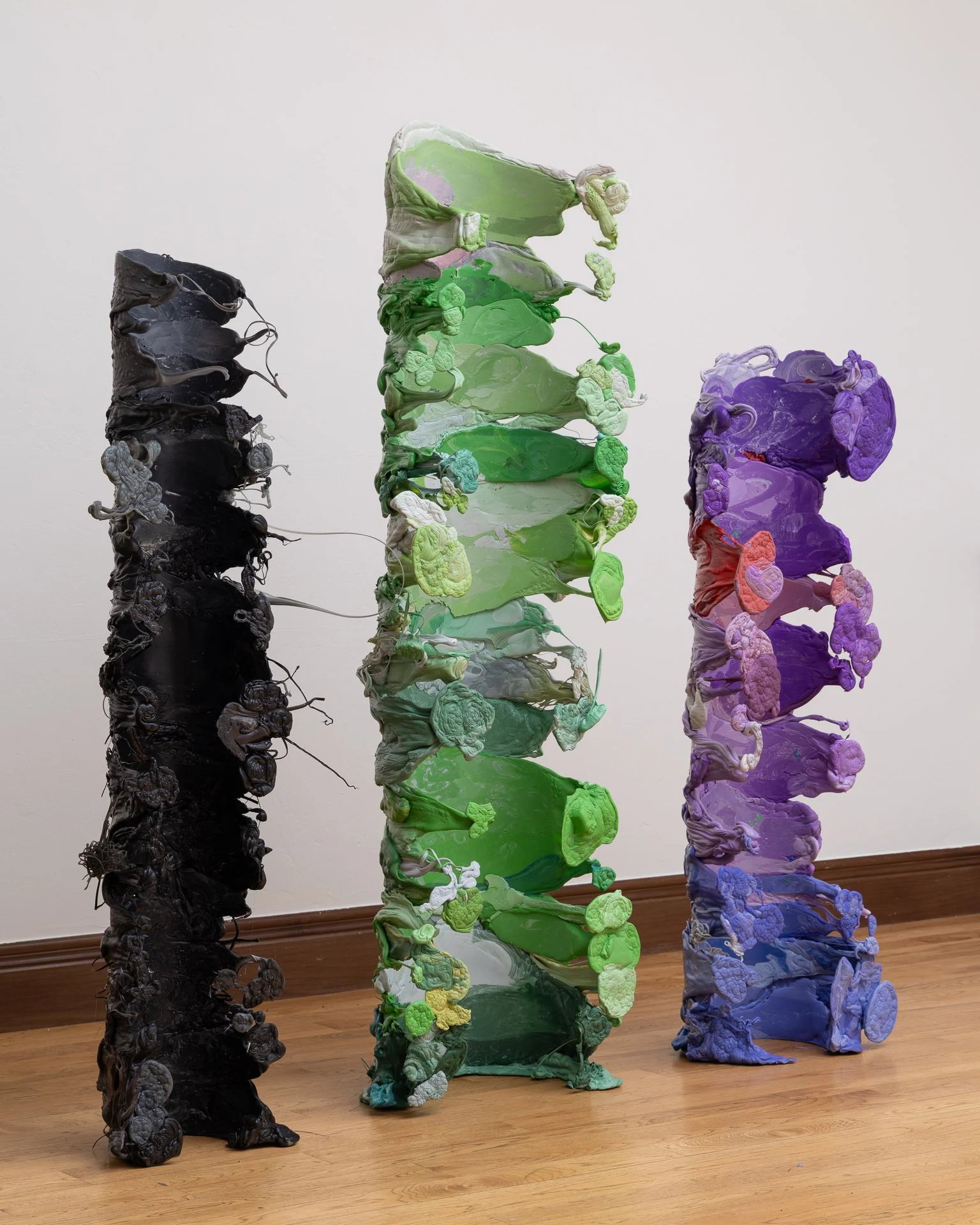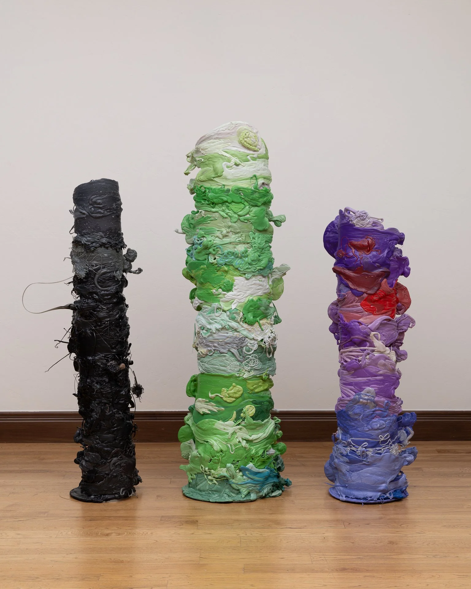 From left, ‘Primitive #3’ 2026, 59” x 17” x 11” Reclaimed plastic, ‘Primitive #1’ 2026, 69” x 18” x 15” Reclaimed plastic, ‘Primitive #1’ 2026, 54” x 14” x 12” Reclaimed plastic