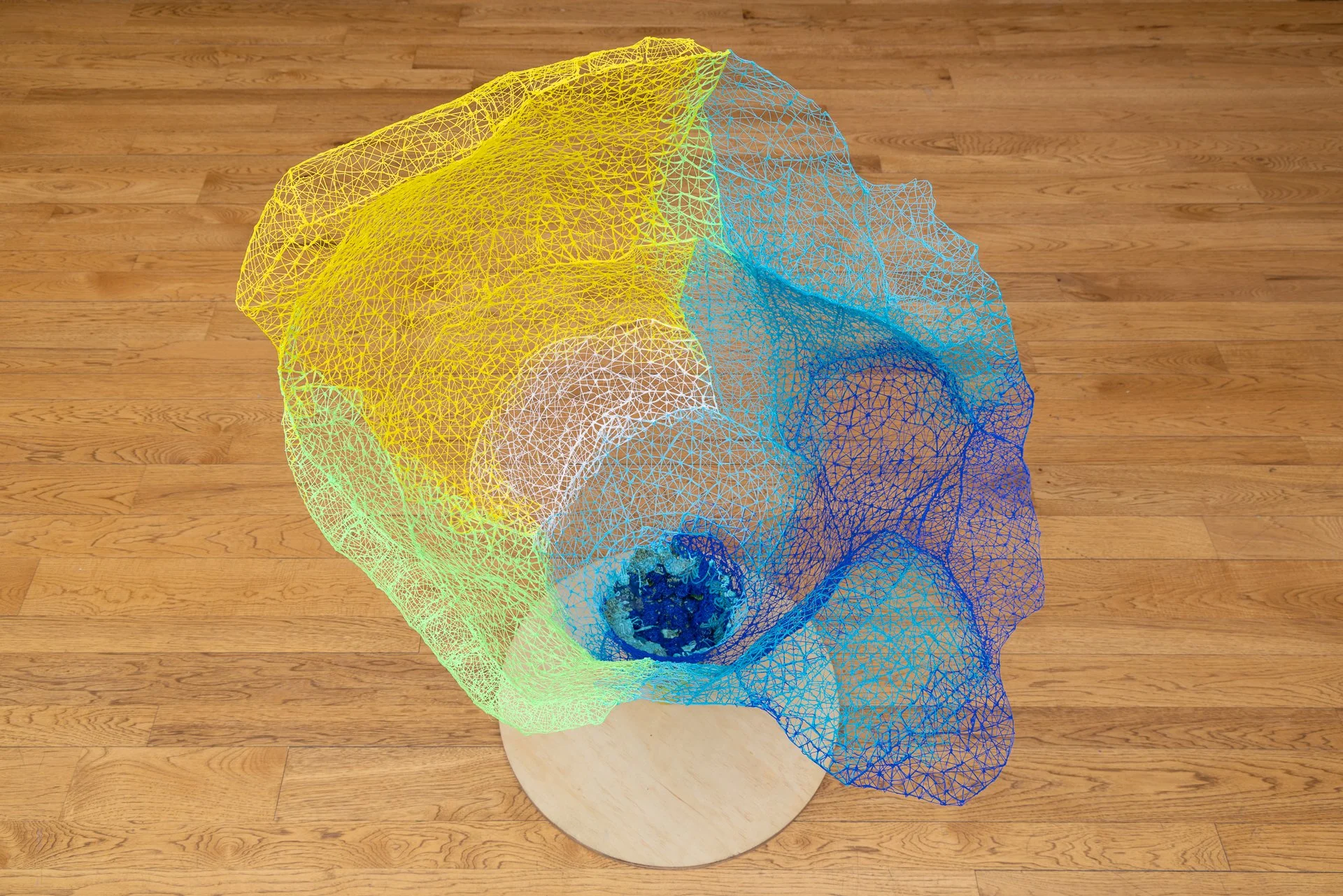 ‘Untitled’ 2026, 24"(w) x *36"(h) x 25"(d), 3D pen-formed bio-plastic, reclaimed plastic, wood.