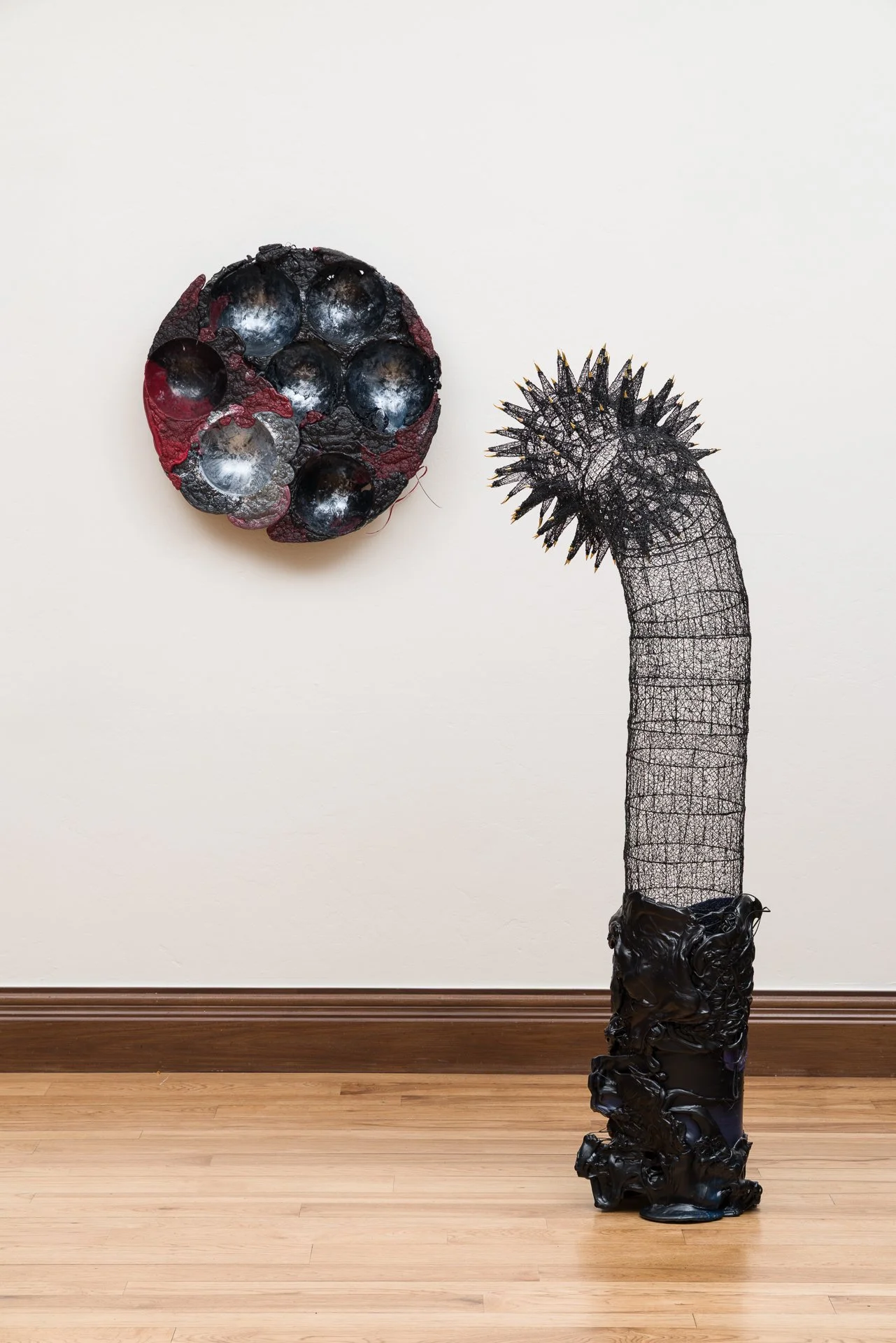 ‘Gothika’ 2026, [Dyptich] 20"(w) x 63"(h) x 14"(d) and 26"(w) x 26" (h) x 5"(d), 3D pen-formed bio-plastic, reclaimed plastic, metal studs, pigment.